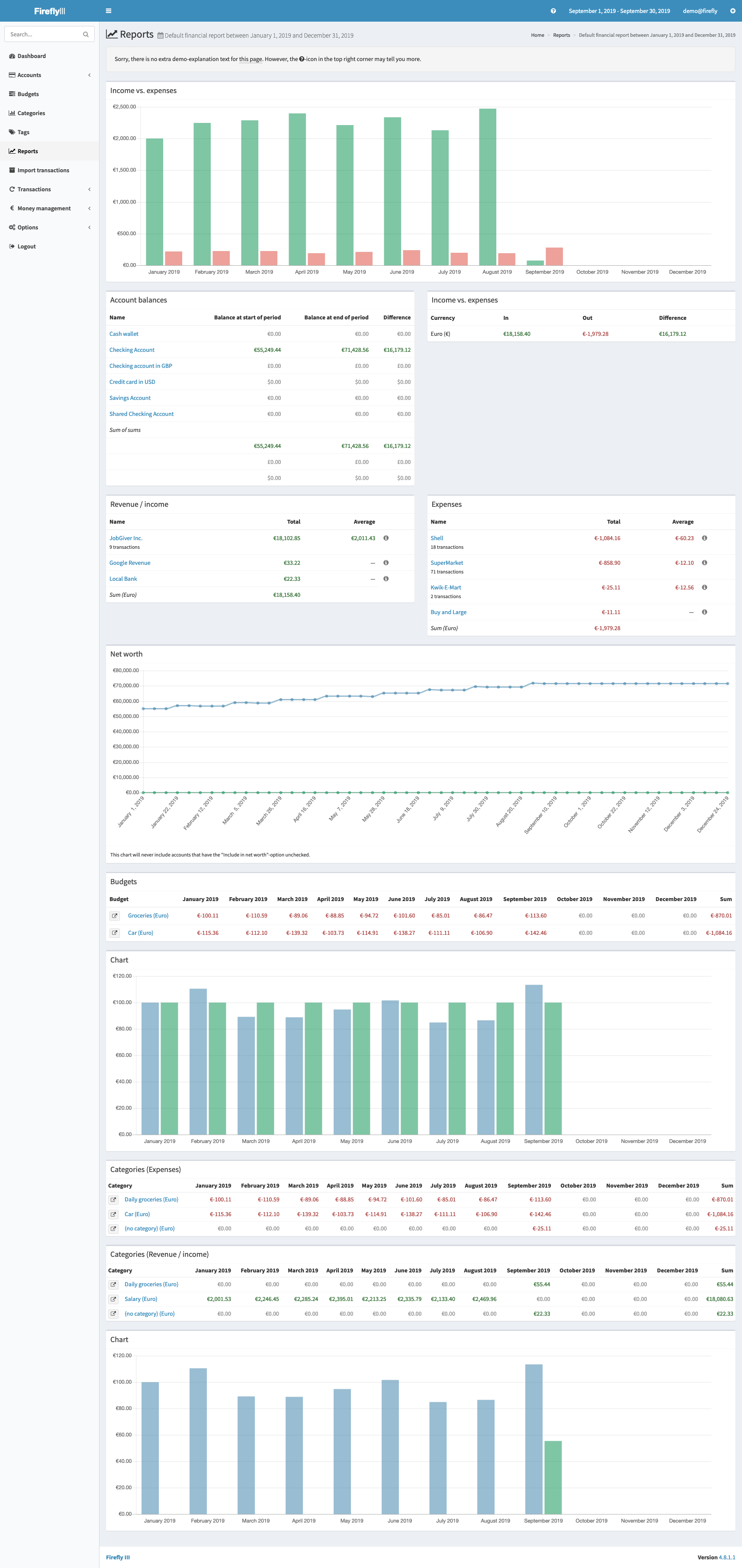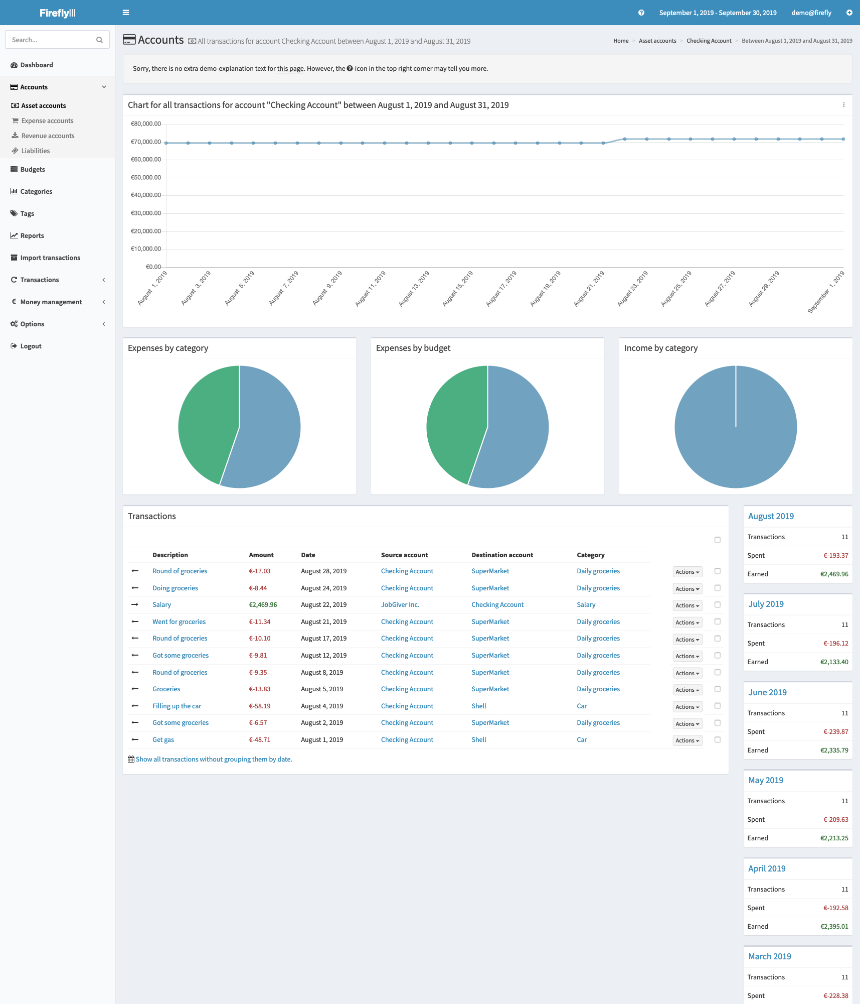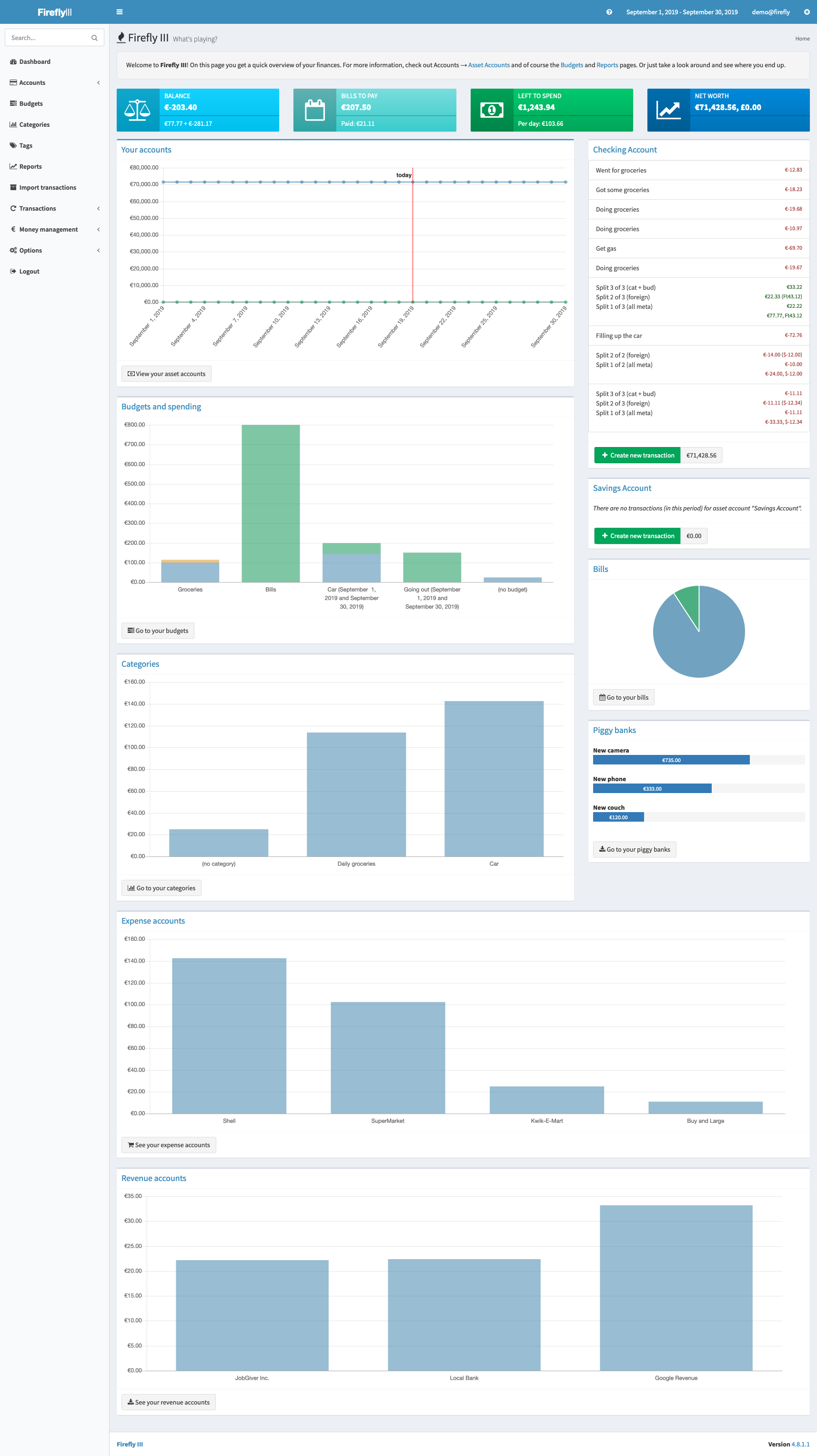 Screenshots Check it out yourself on the demo site. The index of Firefly III The account overview of Firefly III Overview of all budgets A financial report in Firefly III Was this page helpful? Thanks for your feedback! Sorry to hear that :(. Please leave your feedback down here or on GitHub. Thank you!